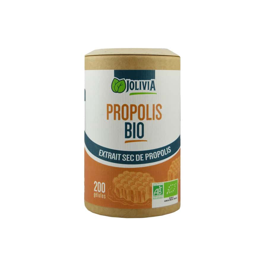 Conditionné en pot de 200 gélules dosées à 250 mg d'extrait sec de propolis biologique.