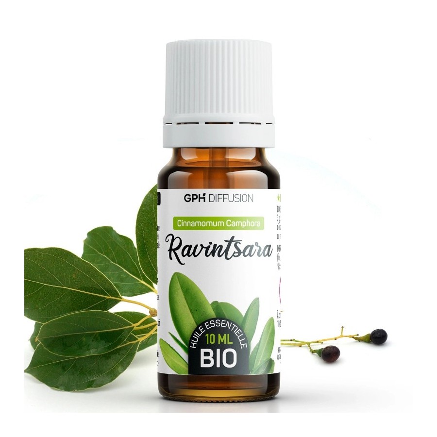 Huile essentielle pure et naturelle biologique de Ravintsara (Cinnamomum camphora) de la famille des lauracées.