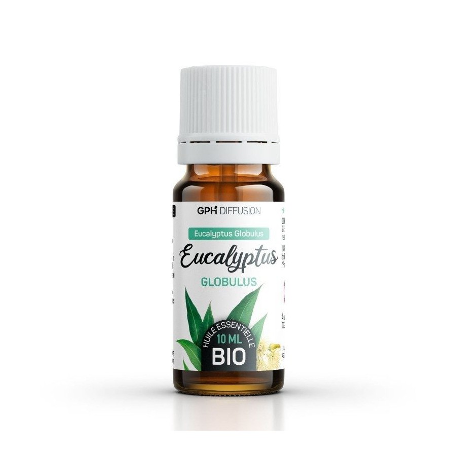 Huile essentielle pure et naturelle biologique d'eucalyptus globuleux (Eucalyptus globulus), de la famille des myrtacées.