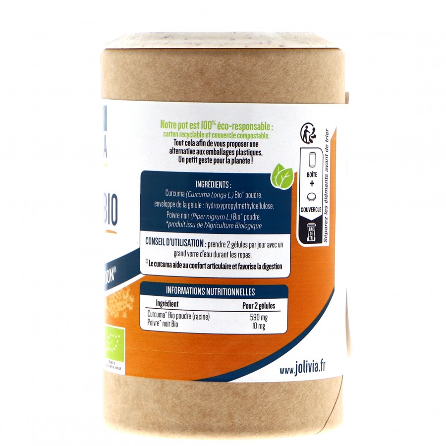 Curcuma bio* (curcuma longa) 295 mg (origine Inde), poivre noir bio* (piper nigrum) 5 mg, enveloppe de la gélule : hydroxypropylméthylcellulose.