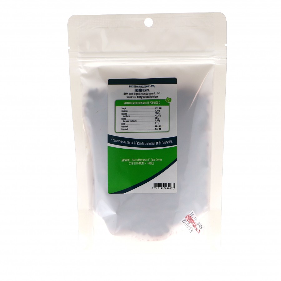 Nos baies de Goji séchées Bio sont conditionnées en sachet de 200 g.