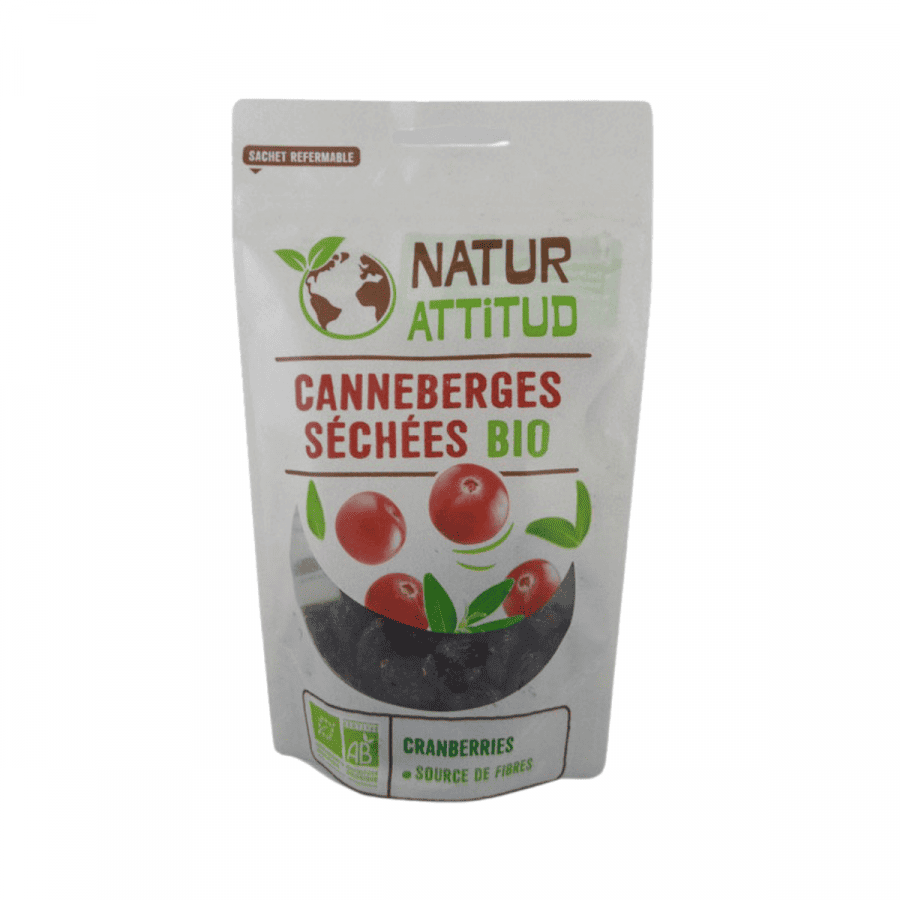 Sachet de 100g de canneberges bio de la marque Natur Attitud. Les canneberges sont également appelées cranberries.