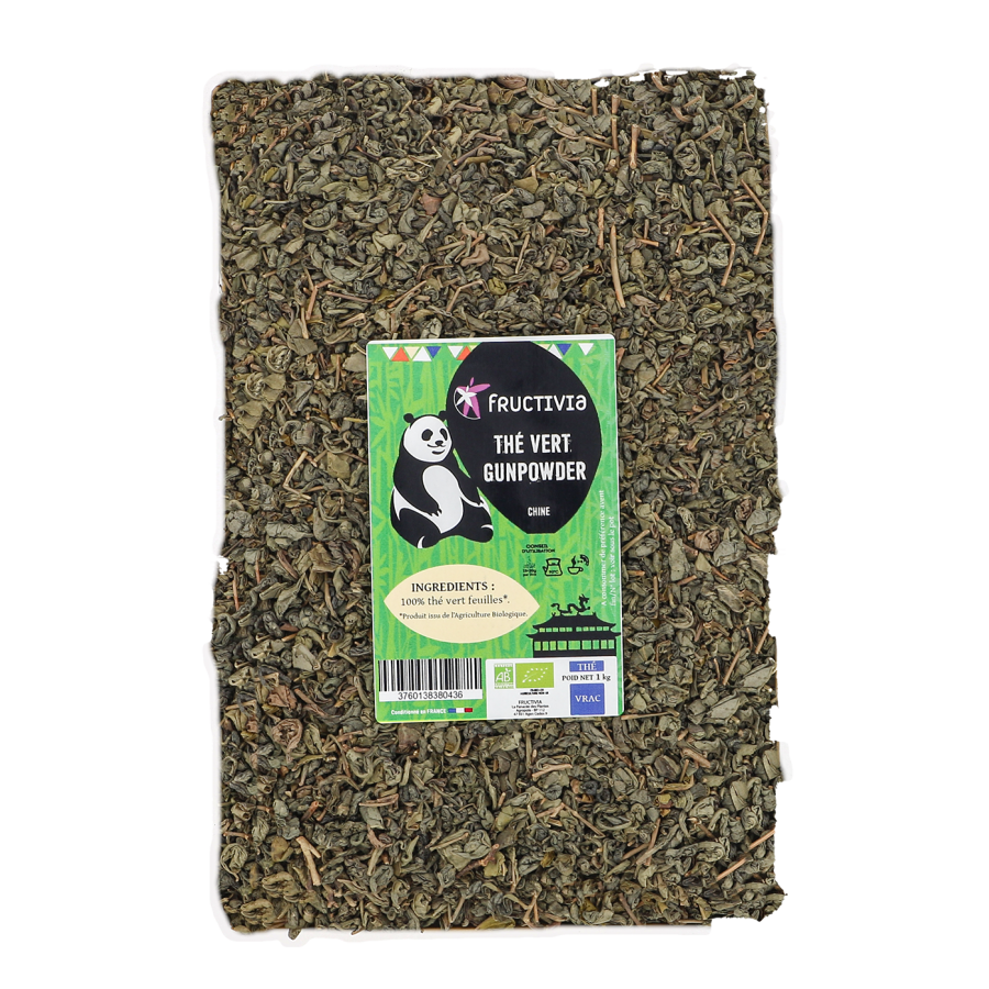 Thé vert gunpowder Bio conditionné en sachet de 1 kg.