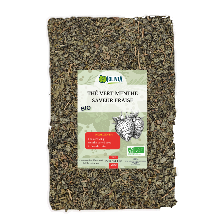 Thé vert menthe Bio saveur Fraise conditionné en sachet de 1 kg.
