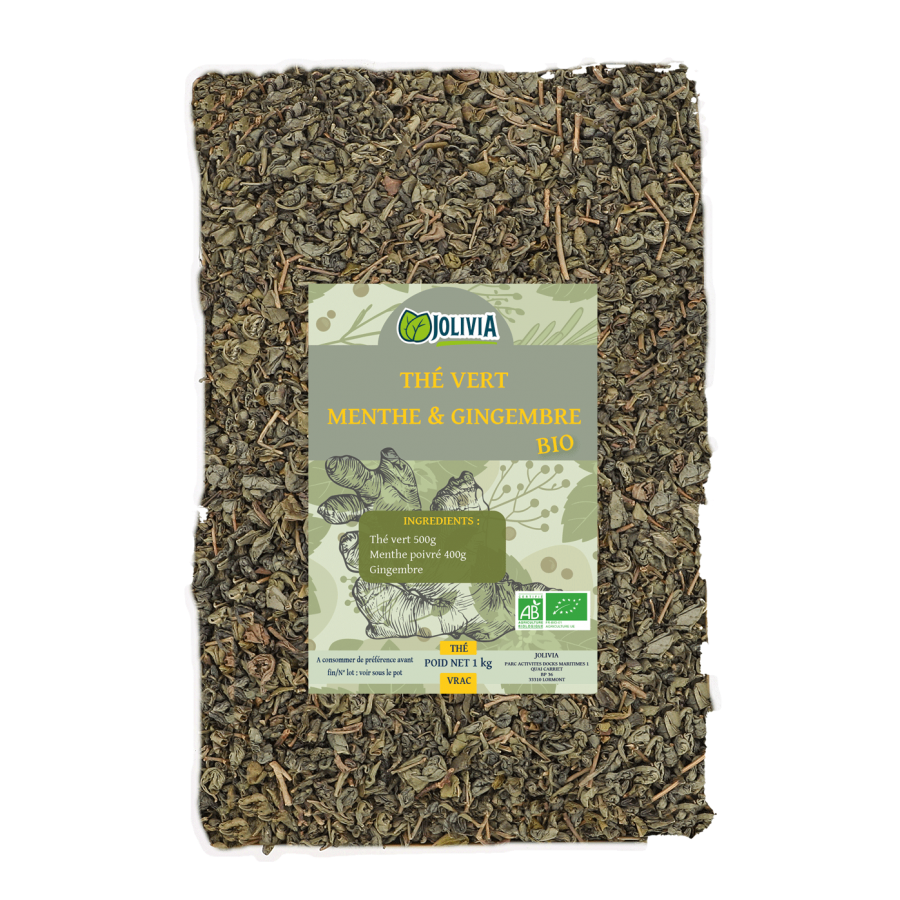 Thé vert menthe & gingembre Bio conditionné en sachet de 1 kg.